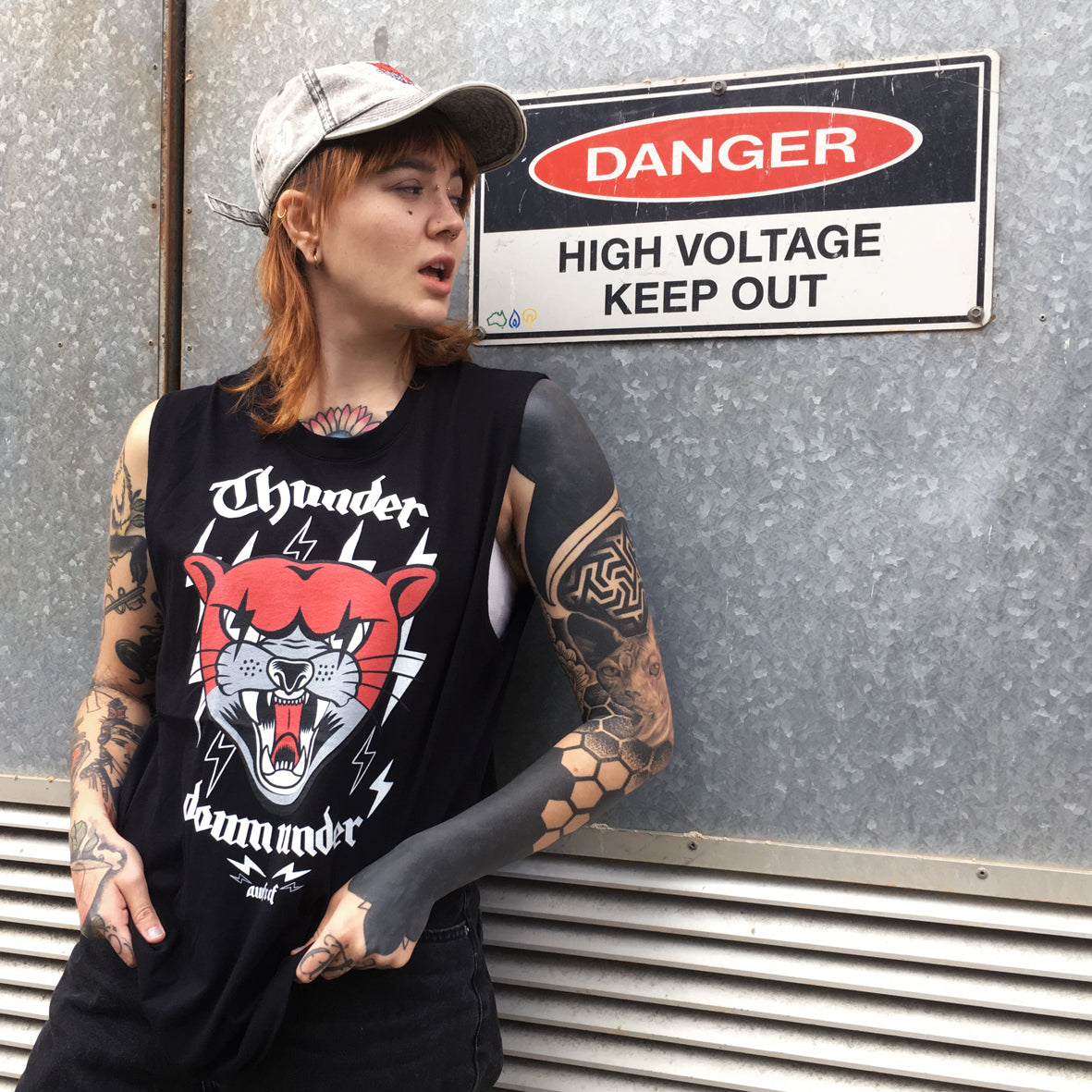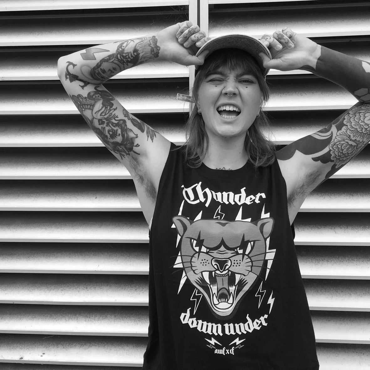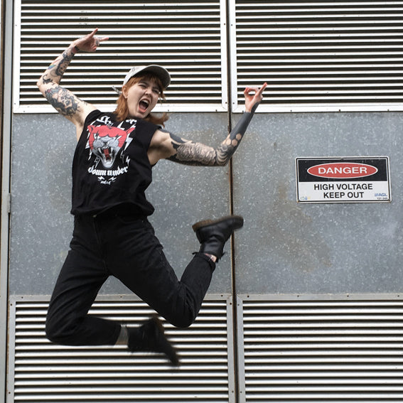 This collab between Cat Franke and Alternative Women’s Fitness combines Punk, Cats and Attitude to get you in the mood for all your daily activities from ass-kicking to beer-sipping. The logo, custom designed by Ruth Mora @_meanmachine, was inspired by Cat's iconic (and favourite) knee tattoo and AWF's signature lightning bolt found in their hearts. What a better way to combine powers than to have a roaring panther shooting lightning bolts out of its eyes?!