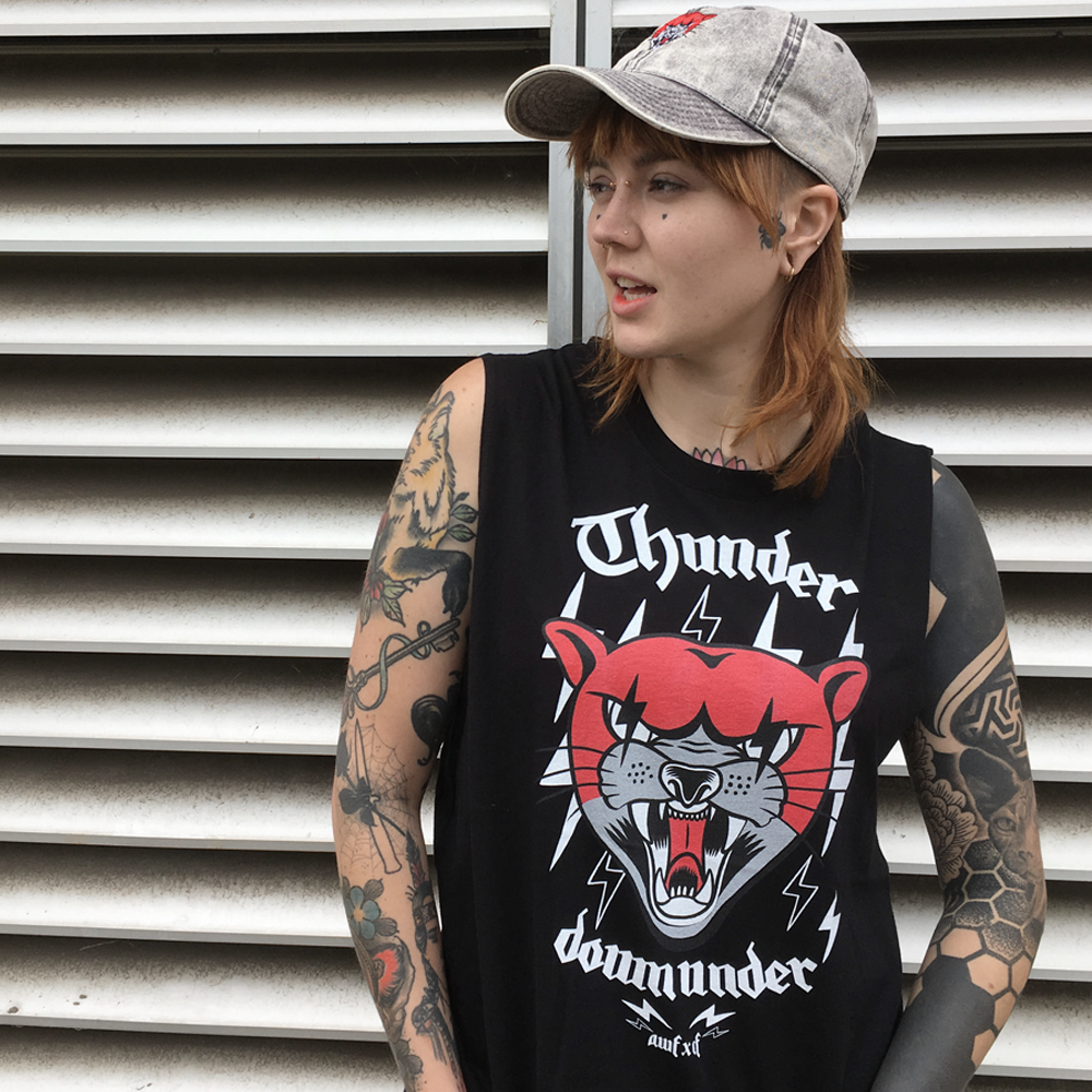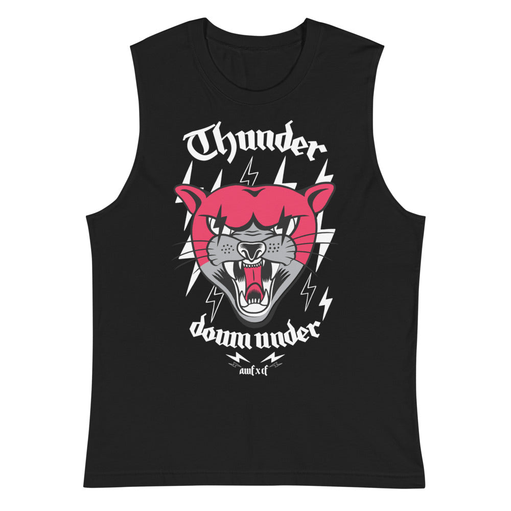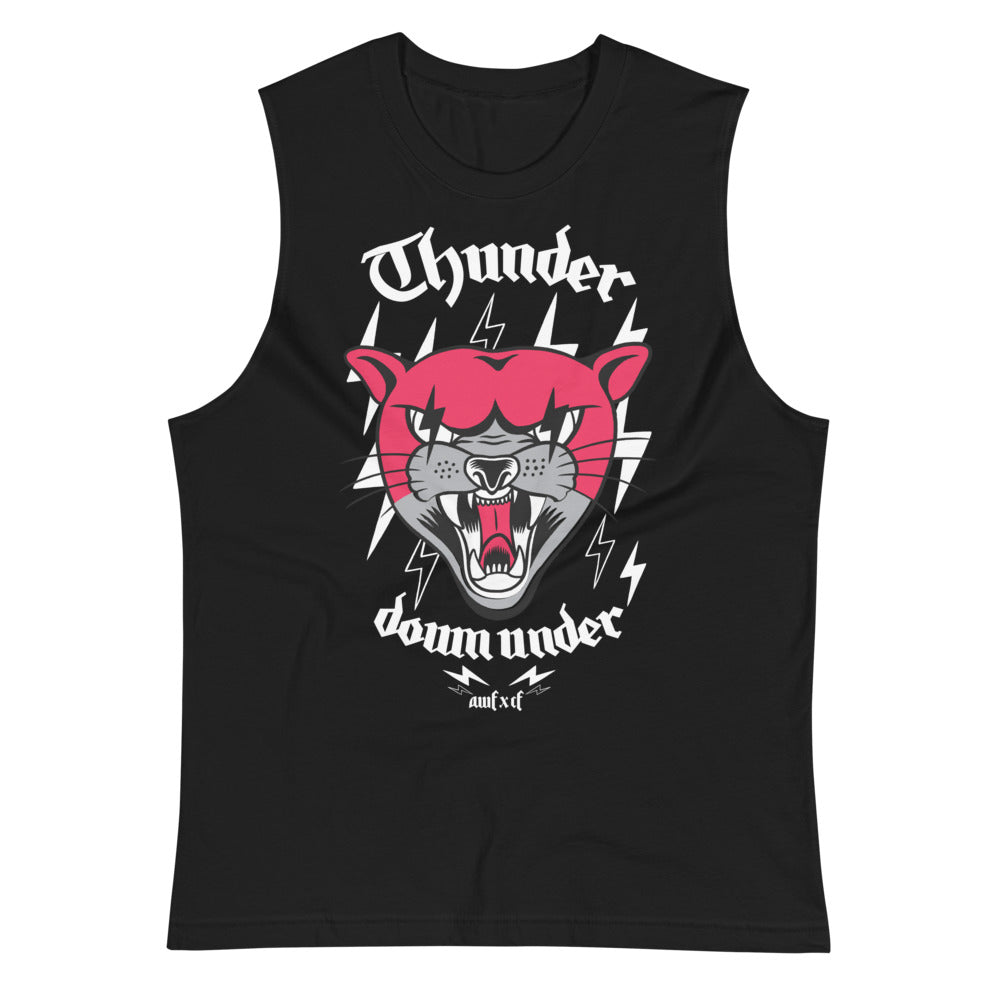 There's a Thunder Down Under and it's taken Melbourne by storm! Let 'em know you're a force to be reckoned with, make that workout beg for mercy then sing ya own praises round the block in the THUNDER DOWN UNDER MUSCLE Tank. The design features the signature Cat print in POP RED with white bolts behind on the front and logo on the back in white.