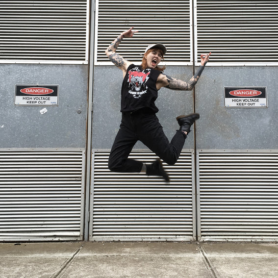 This collab between Cat Franke and our previous incarnation Alternative Women's Fitness combines Punk, Cats and Attitude to get you in the mood for all your daily activities from ass-kicking to beer-sipping. The logo, custom designed by Ruth Mora @_meanmachine, was inspired by Cat's iconic (and favourite) knee tattoo and AWF's signature lightning bolt found in their hearts. What a better way to combine powers than to have a roaring panther shooting lightning bolts out of its eyes?!