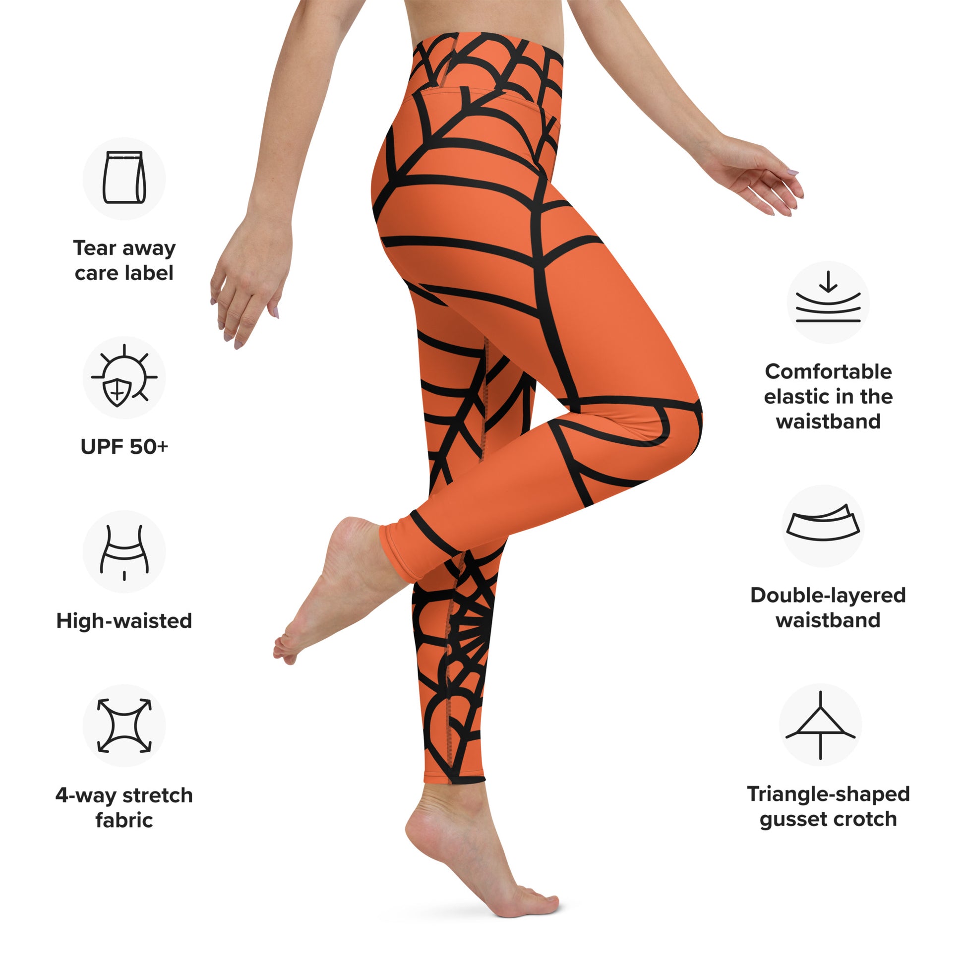 Build your own web by flexing and twisting in these stretchy orange leggings. They're great for anyone who either loves to be eerie or doesn't subscribe to MOR patterned leggings. They also mix, match or clash patterns with other pieces in our active range, adding thread upon thread until you have all your enemies wound up tight.