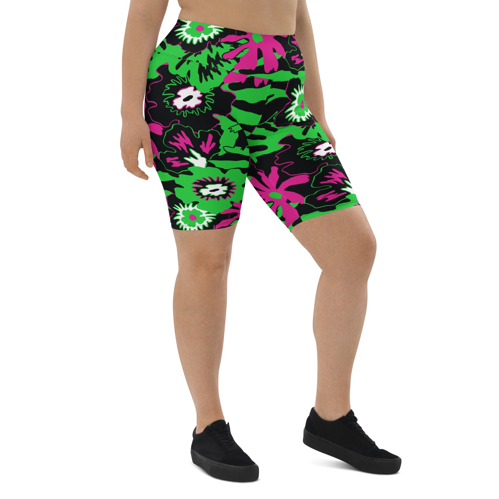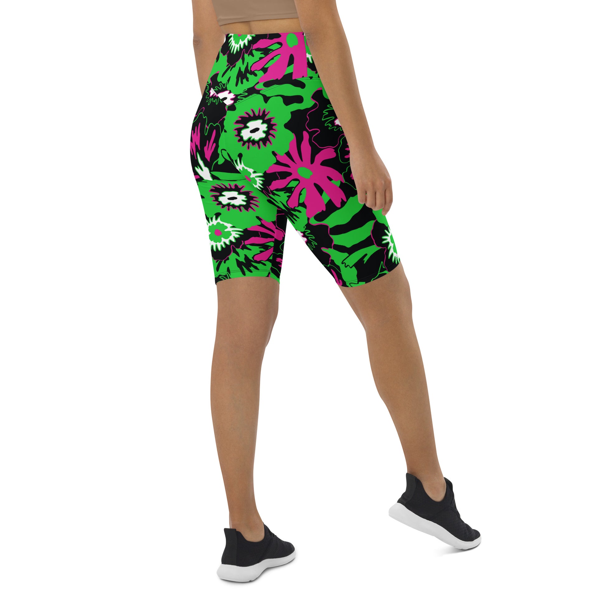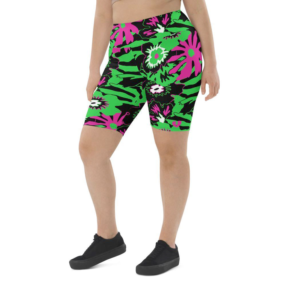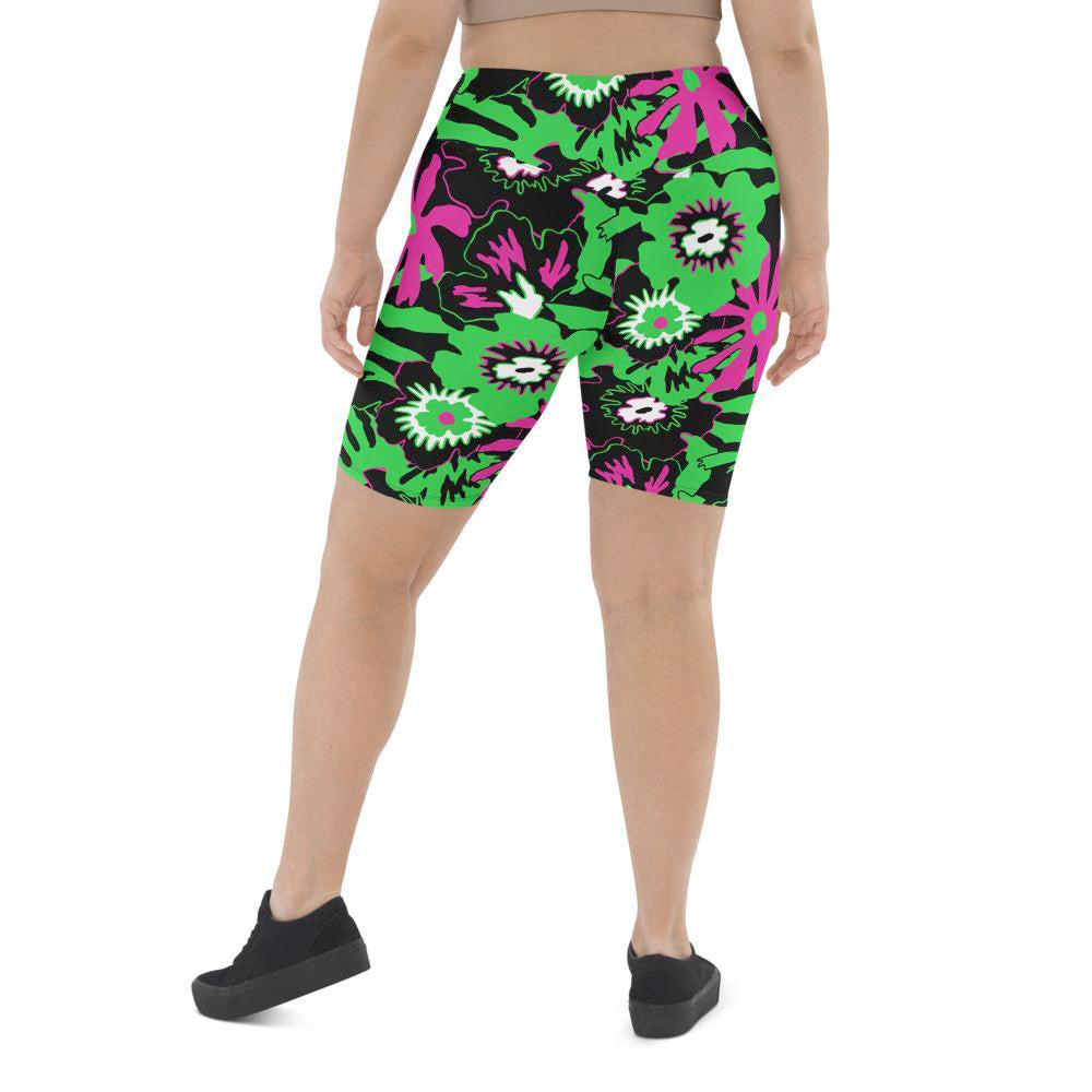 Tee up your next horrorday in these Wild Flower Monster Green extra long shorts. Featuring a classic '50s horror colourway of flamingo pink and toxic waste green, these high-waisted, flattering long-line bike pants do the butt-lifting for ya. Yeah for reals - that's not sexually harassing ghosts you're feeling; these shorts are designed to lift your booty.