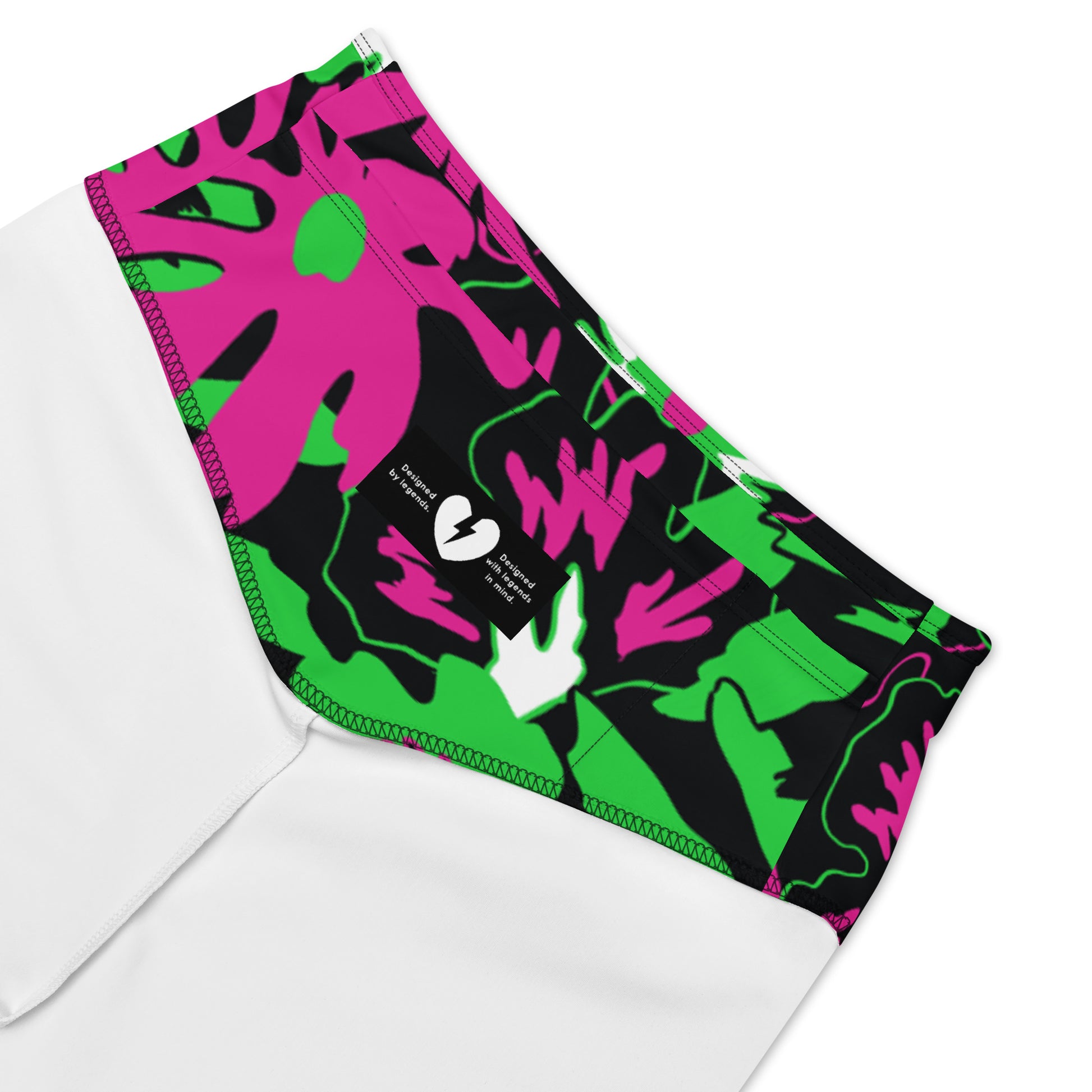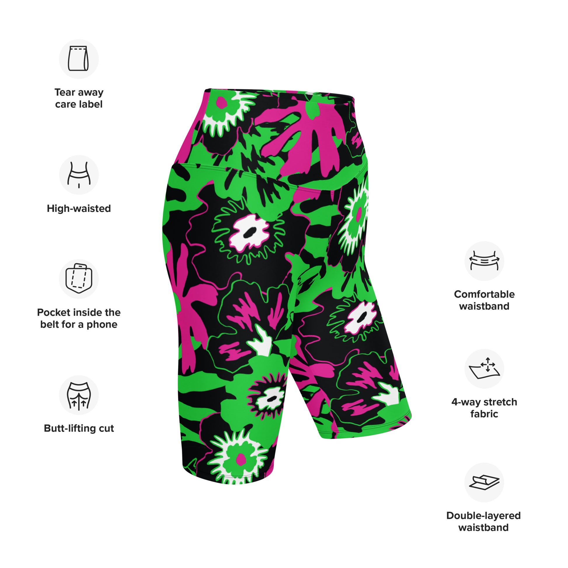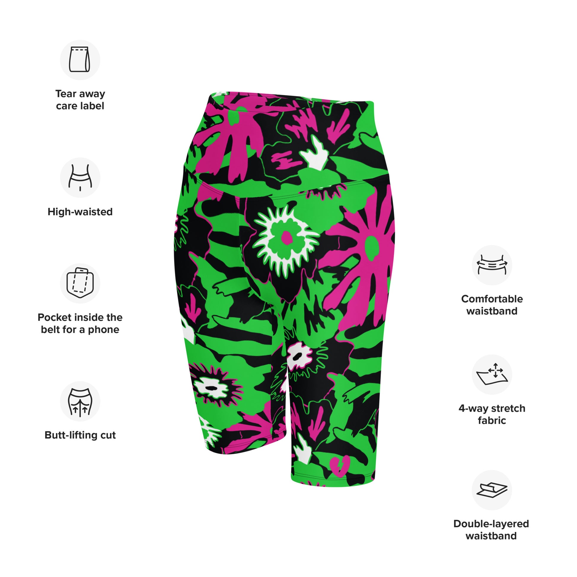Tee up your next horrorday in these Wild Flower Monster Green extra long shorts. Featuring a classic '50s horror colourway of flamingo pink and toxic waste green, these high-waisted, flattering long-line bike pants do the butt-lifting for ya. Yeah for reals - that's not sexually harassing ghosts you're feeling; these shorts are designed to lift your booty.